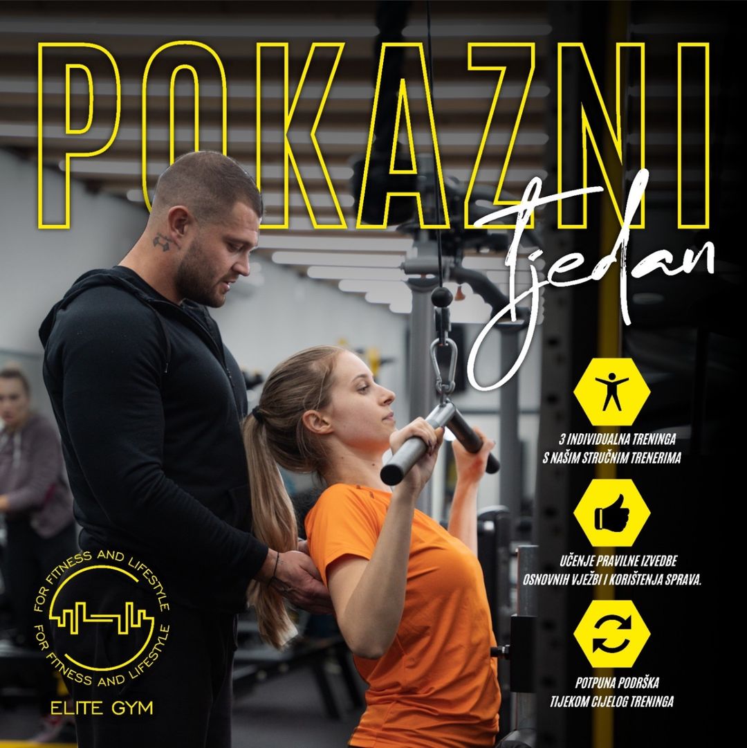 Svrha pokaznog tjedna je kroz 3 individualna termina podučiti vas pravilnoj izvedbi osnovnih vježbi te korištenju svih sprava u teretani